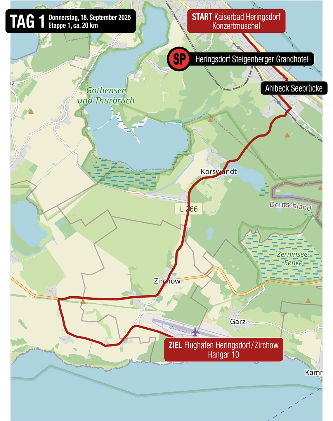 17:32 Uhr | Ziel | Tag 1 - "Prolog d. Kaiserbäder" | Flughafen Heringsdorf | Świnoujście / Swinemünde (PL) | |